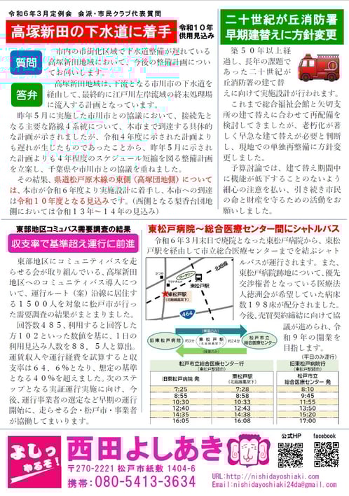 2024 · 23日 4月 2024 2024年4月作成のチラシを掲載 2024年3月議会が閉会しました。令和6年度予算をはじめとする全12議案を審議しました。 私自身も予算委員を務めさせていただき、未来の松戸市の姿を思い描きながら、予算書を読み込み、理事の方々と向き合う日々を過ごしました。 3月議会の様子をはじめ市政報告をまとめました。お読みいただけましたら幸いです。 tagPlaceholderカテゴリ: